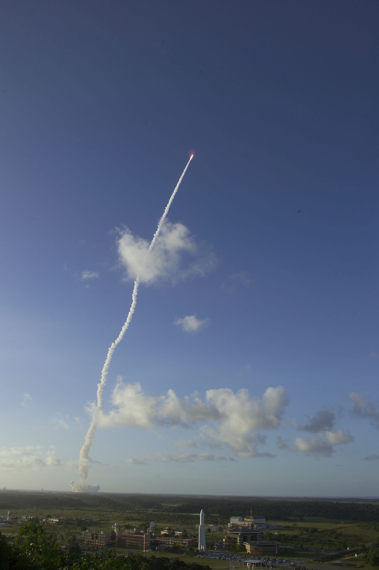 22:05 Uhr: T plus 1 Minute. Die Ariane 5 ECA hat mit infernalischem Brüllen abgehoben und startet in den klaren blauen Himmel!