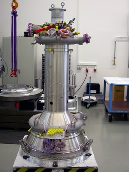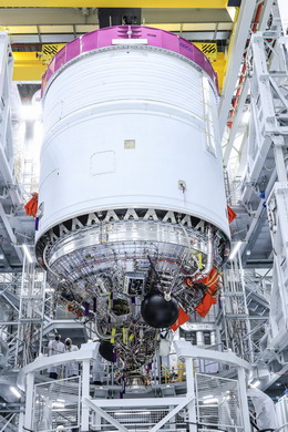Dieses im Oktober 2020 bei der ArianeGroup in Bremen integrierte „hot-firing model” der kompletten Ariane-6-Oberstufe ist nach umfangreichen Funktionstests voll einsatzfähig. Sein neues wiederzündbares Vinci-Triebwerk ist an zwei Flüssigwasserstoff- und Flüssigsauerstofftanks angeschlossen und mit allen Leitungen, Ventilen sowie elektronischen und hydraulischen Instrumenten und Steuerungssystemen ausgestattet.