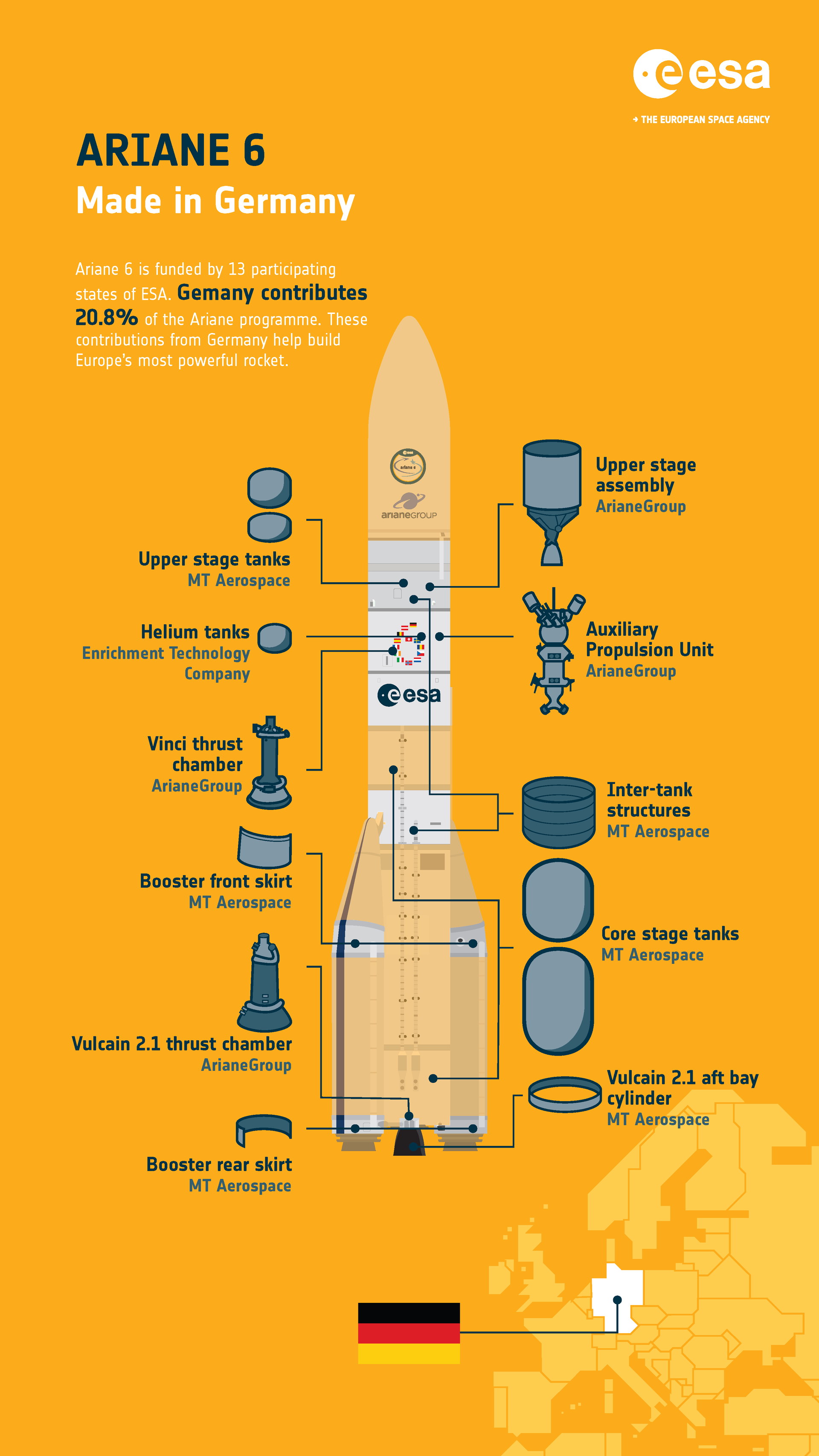 Ariane 6 wird unter der Verantwortung der ArianeGroup entwickelt und gebaut, zu der sowohl französische als auch deutsche Tochtergesellschaften gehören. Die deutsche Niederlassung fertigt die Schubkammer für die Triebwerke Vinci und Vulcain 2.1. Die deutsche und die französische Niederlassung der ArianeGroup arbeiten gemeinsam an der Herstellung der Hilfsantriebseinheit, die die Tanks der Oberstufe unter Druck setzt und das Vinci-Triebwerk für die Wiederzündung vorbereitet. Sie kann auch zum Verlassen der Umlaufbahn der Oberstufe am Ende der Mission verwendet werden und unterstützt damit den Zero-Debris-Ansatz der ESA.