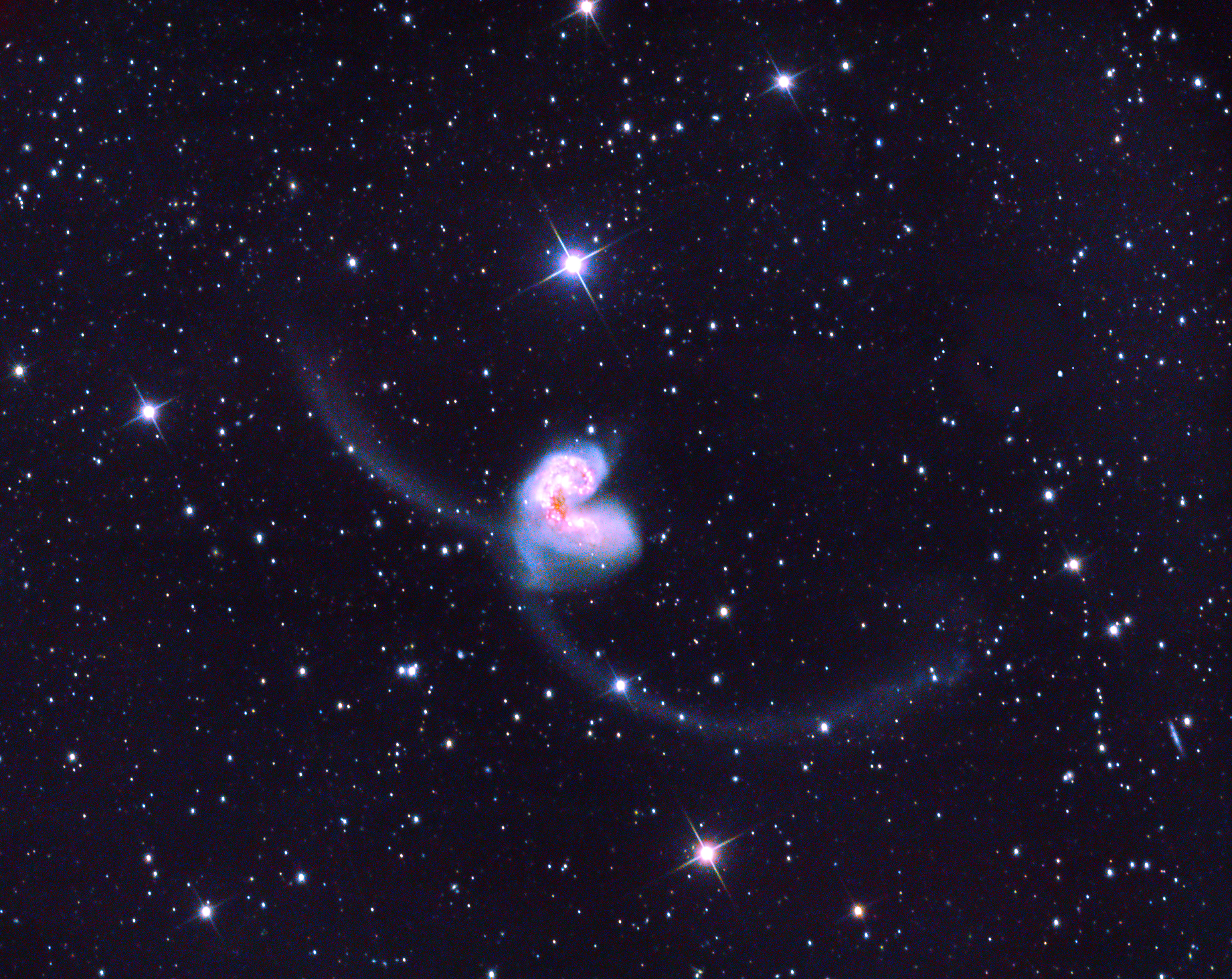 Auf diesem Bild ist die turbulente Verschmelzung besser zu sehen. Leuchtende, pinke und rote Gaswolken umgeben helle blaue Regionen, in denen massenhaft junge Sterne entstehen, teilweise verdeckt von dunklen Staubbändern. Die Sternentstehungsrate ist so hoch, dass das System als Starburst-Galaxie gilt. Das beschreibt einen Zustand, bei dem eine Galaxie in einer relativ kurzen Phase extrem intensiver Sternentstehung durchläuft, so stark, dass sie ihren verfügbaren Gasvorrat wesentlich schneller verbrauchen würde als eine normale Galaxie. Diese Phase kann jedoch nicht ewig anhalten. Schließlich werden die Kerne der beiden Galaxien verschmelzen und sich zu einer einzigen großen elliptischen Galaxie vereinen.
