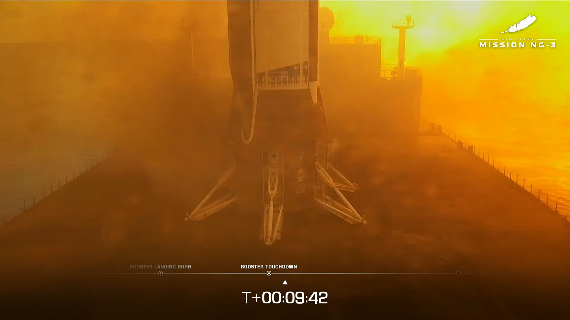 Bei T+03:44 hatte das Fairing seinen Dienst getan und wurde abgeworfen. Die Höhe der Erststufe stieg zu der Zeit noch, erreichte ihren Maximalwert und begann ihren Fall Richtung Erde. Bei T+07:07 wurde der Reentry Burn gestartet um die Geschwindigkeit des Boosters vor dem Auftreffen auf die Atmosphäre zu verringern. Die weitere Verlangsamung des Boosters wurde dann durch die Atmosphäre verursacht. Auch bei New Glenn konnte das schon bekannte Glühen der Triebwerkssektion in dieser Flugphase beobachtet werden.