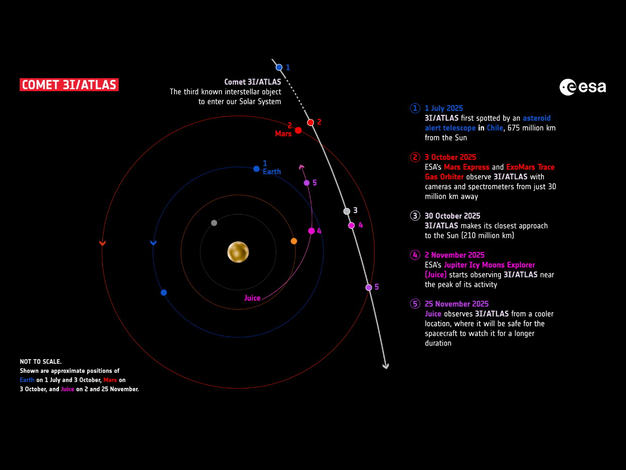 Zwischen dem 1. und 7. Oktober richteten der ExoMars Trace Gas Orbiter (TGO) und die Raumsonde Mars Express der ESA ihre Aufmerksamkeit auf den interstellaren Kometen 3I/ATLAS, als dieser in der Nähe des Mars vorbeiflog.