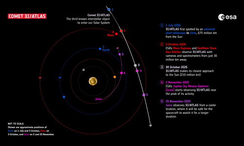 „Da sich Juice derzeit in der Nähe der Sonne befindet, nutzt es seine Hauptantenne mit hoher Verstärkung als Hitzeschild. Es verwendet seine kleinere Antenne mit mittlerer Verstärkung, um Daten mit einer viel geringeren Geschwindigkeit zur Erde zurückzusenden. Außerdem befindet es sich weit von der Erde entfernt, auf der anderen Seite der Sonne. Daher erwarten wir erst im Februar 2026 Daten von Juices Beobachtungen von 3I/ATLAS.„