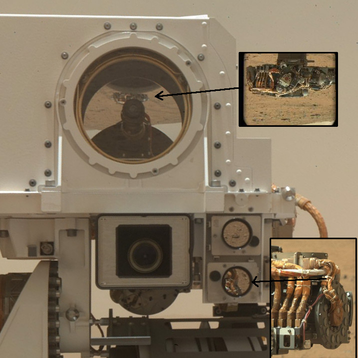 In einer vergrößerten Version dieses Mosaiks werden sogar Details der Oberfläche des Mars‘ und des Rovers sichtbar, welche durch die Optiken der verschiedenen Kamerasysteme reflektiert werden.