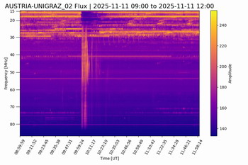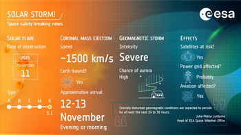 Am 11. November 2025 wurde eine intensive Sonneneruption beobachtet, deren Höhepunkt um 10:04 UTC erreicht wurde. Weniger als eine Stunde später wurde ein koronaler Massenauswurf (CME) beobachtet, dessen Anfangsgeschwindigkeit auf etwa 1500 km/s geschätzt wurde und der am späten Abend des 12. November oder am frühen Morgen des 13. November die Erde erreichen sollte, wobei diese Schätzungen jedoch mit einer gewissen Unsicherheit behaftet sind.