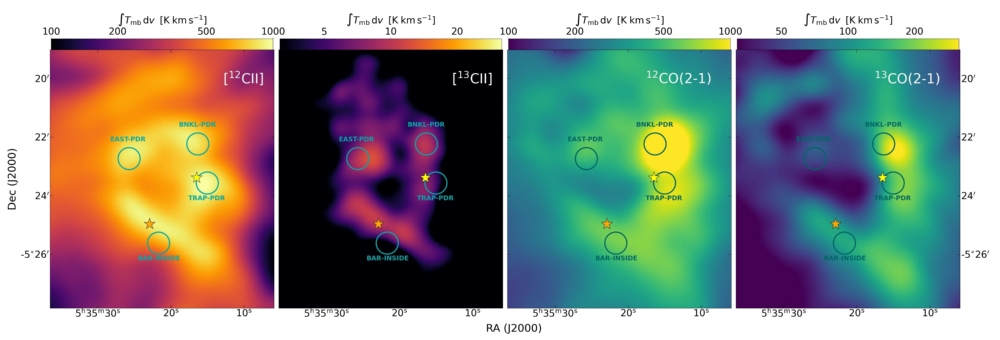 ![upGREAT/SOFIA [12CII]-, [13CII]- sowie IRAM 12CO- und 13CO- integrierte Linienintensitäten im Zentrum des Orionnebels. Die Kreise zeigen die Positionen der Yebes 40m Beobachtungen. (Foto: Pabst et al. 2024)](https://www.raumfahrer.net/wp-content/uploads/2024/08/LinienintemsitaeteninOMC1Pabstetal26.jpg)