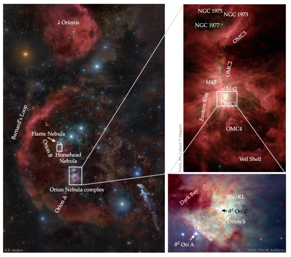 Von uns aus gesehen liegt hinter dieser hellen Sternengruppe eine vergleichsweise dichte und sehr kalte Molekülwolke mit bis zu zehn Millionen Partikeln pro Kubikzentimeter und nur 30 Grad Celsius über dem absoluten Nullpunkt (30 Kelvin), wie frühere Radiobeobachtungen von IRAM und Yebes ergaben. Diese wehrt sich immer noch erfolgreich gegen eine Zerstörung durch die intensive Bestrahlung, die von ihrer heißen Nachbarschaft ausgeht. Währenddessen hat sich eine gigantische Plasmablase mit einem Radius von bis zu 2 Parsec (1 pc = 3,26 Lichtjahre) ausgebreitet, wobei sie das verdrängte Gas in eine dünne sie umgebende Hülle zusammengeschoben hat. Die intensive Strahlung sowie die Winde der Sternengiganten beschleunigen dieses Plasma und erhitzen es auf eine Temperatur von einer Million Kelvin. Es hat eine extrem geringe Dichte mit nur einem Partikel pro Kubikzentimeter und dehnt die Materiehülle trotzdem mit einer Geschwindigkeit von 13 km/s weiter aus, wie die hochaufgelösten Spektren von SOFIA zeigen.