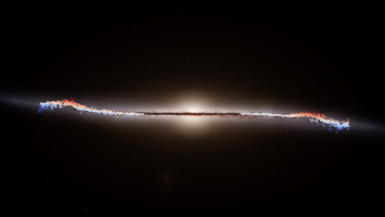 Die Bewegungen der Sterne werden durch die weißen Pfeile in der oben abgebildeten Seitenansicht der Milchstraße sichtbar gemacht. Auffällig ist, dass das Wellenmuster der vertikalen Bewegungen (dargestellt durch die Pfeile) gegenüber dem Wellenmuster, das durch die vertikalen Positionen der Sterne gebildet wird (angezeigt durch die Farben Rot/Blau), leicht horizontal verschoben ist.