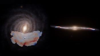Auf dem linken Bild betrachten wir unsere Galaxie von „oben“. Auf der rechten Seite sehen wir einen vertikalen Ausschnitt der Galaxie und betrachten die Welle von der Seite. Diese Perspektive zeigt, dass sich die „linke” Seite der Galaxie nach oben und die „rechte” Seite nach unten krümmt (dies ist die Verformung der Scheibe). Die neu entdeckte Welle ist in Rot und Blau dargestellt: In den roten Bereichen liegen die Sterne oberhalb und in den blauen Bereichen unterhalb der verformten Scheibe der Galaxie.