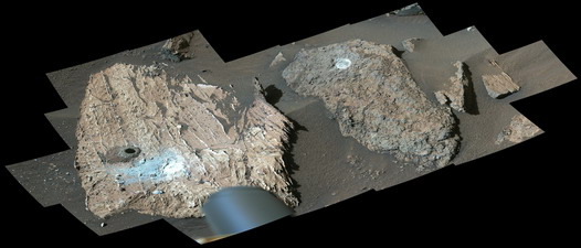 Perseverance setzte das Instrument Mastcam-Z am Kopf des Marsrovers ein, um den Arbeitsbereich um die von einem Felsen mit dem Spitznamen „Cheyava Falls“ entnommene Probe zu untersuchen. Ganz links ist ein Bohrloch zu sehen, aus dem der Rover am 21. Juli 2024 eine Probe entnommen hat. Rechts befindet sich der Felsen mit dem Spitznamen „Steamboat Mountain“. Auf jedem ist eine kreisförmige, weiße Abriebstelle erkennbar. Hier hat der Rover mit einem Abriebwerkzeug etwas Oberfläche des Gesteins abgetragen, um die Zusammensetzung genauer zu untersuchen. Die Bilder, aus denen diese Komposition besteht, wurden am 23. Juli 2024, dem 1.217. Tag (Sol) der Mars-2020-Mission, von der Mastcam-Z aufgenommen. Die Arizona State University leitet den Betrieb des Instruments und arbeitete dabei mit Malin Space Science Systems in San Diego an der Entwicklung, Herstellung, Erprobung und dem Betrieb der Kameras sowie mit dem Niels-Bohr-Institut der Universität Kopenhagen an der Entwicklung, Herstellung und Erprobung der Kalibrierung zusammen. Das DLR-Institut für Weltraumforschung in Berlin ist mit einem Forschungsteam maßgeblich an der taktischen und strategischen Planung von Aufnahmen mit dem Kamerasystem beteiligt.