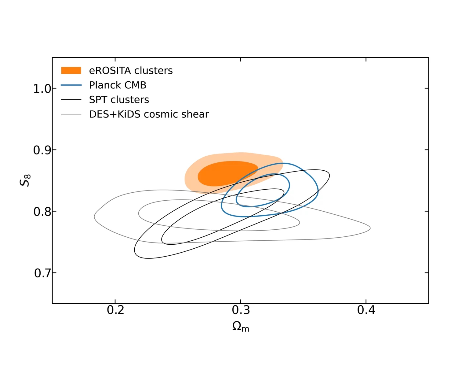 Nach dem kosmischen Standardmodell, dem sogenannten Lambda Cold Dark Matter (ΛCDM)-Modell, war das junge Universum ein extrem heißes, dichtes Meer aus Photonen und Teilchen. Im Laufe der kosmischen Zeit wuchsen winzige Dichteunterschiede zu den großen Galaxien und Galaxienhaufen, die wir heute sehen. Die Beobachtungen der eROSITA-Galaxienhaufen zeigen, dass alle Arten von Materie (sichtbare und dunkle) 29 % der derzeitigen Gesamtenergiedichte des Universums ausmachen – in hervorragender Übereinstimmung mit Werten aus Messungen der kosmischen Mikrowellen-Hintergrundstrahlung aus der Frühzeit des Universums.
