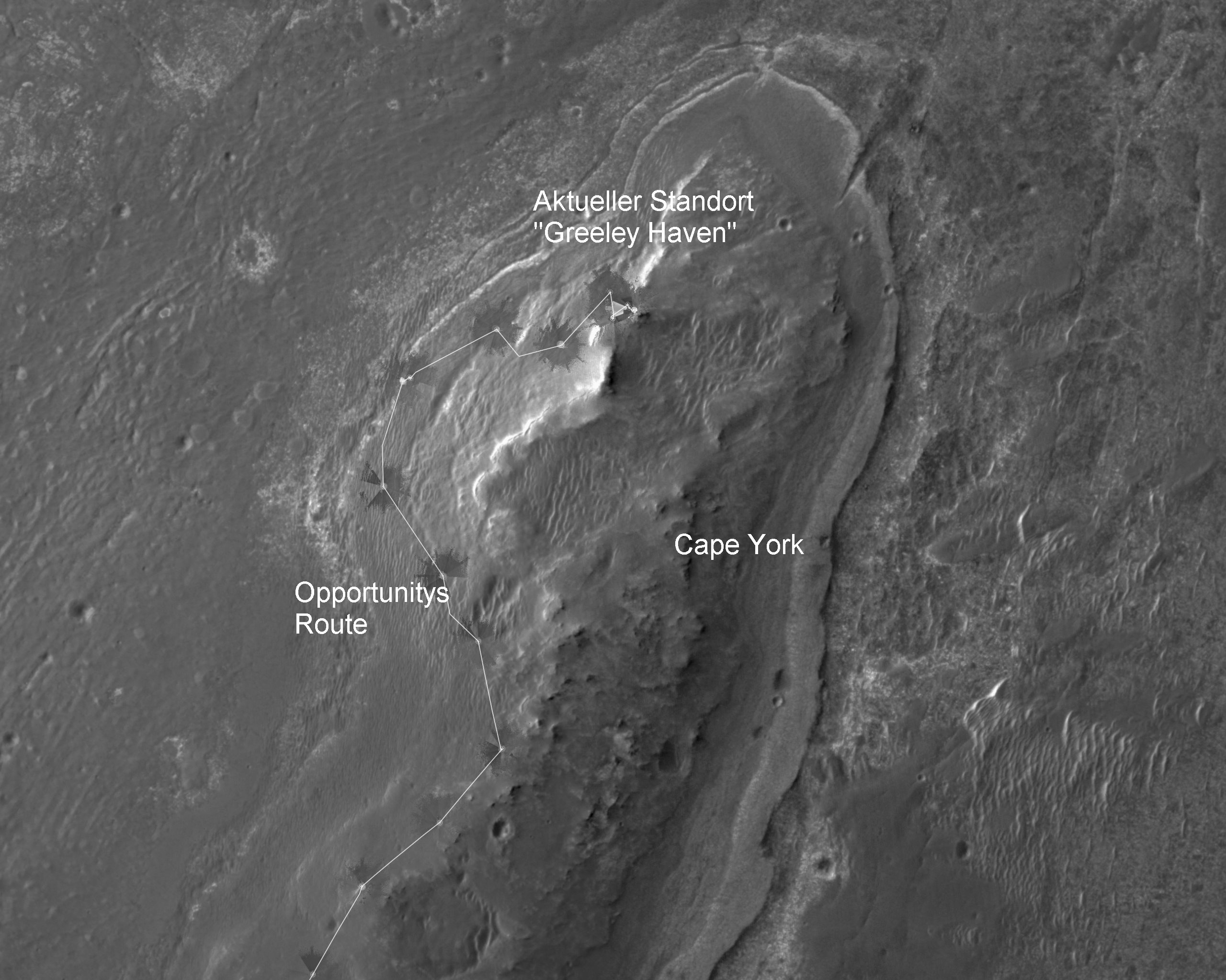 Auf seinem Weg über das Meridiani Planum erreichte Opportunity schließlich am 9. August 2011, dem Sol 2.681 der Mission, den Endeavour-Krater (Raumfahrer.net berichtete). Opportunity befand sich jetzt direkt an der Südspitze des Cape York, einer mehrere hundert Meter langen und nur wenige Meter hohen Geländeerhebung, welche sich direkt am westlichen Rand dieses etwa 22 Kilometer durchmessenden Kraters befindet.