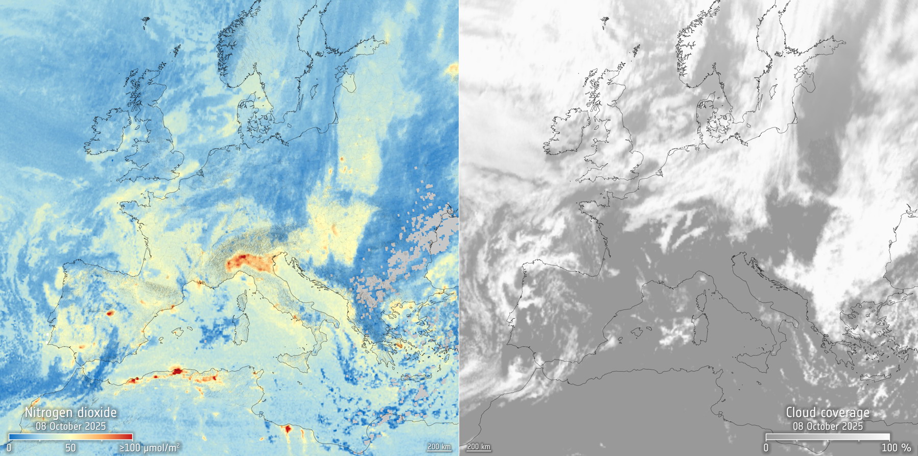 Es ist zu beachten, dass Sentinel-4 kein Stickstoffdioxid über bewölkten Gebieten messen kann, weshalb das Bild in bestimmten Bereichen der Karte keine Konzentrationen anzeigt. Das Bild auf der rechten Seite zeigt die Wolkenbedeckung zum Zeitpunkt der Aufnahme.