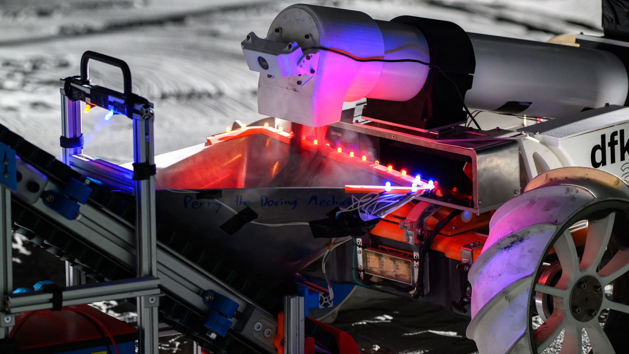 Die Aufgabe der aktuellen ESA Space Resources Challenge war es, Technologien für die Aufbereitung von Mondstaub (Regolith) zu entwickeln. Aus Regolith können zum Beispiel Sauerstoff und Baumaterialien direkt vor Ort auf dem Mond gewonnen werden. Das DLR und das DFKI treten zusammen als Team BREMEN bei dem Wettbewerb an und testeten Ihr System in der LUNA-Halle in Köln.